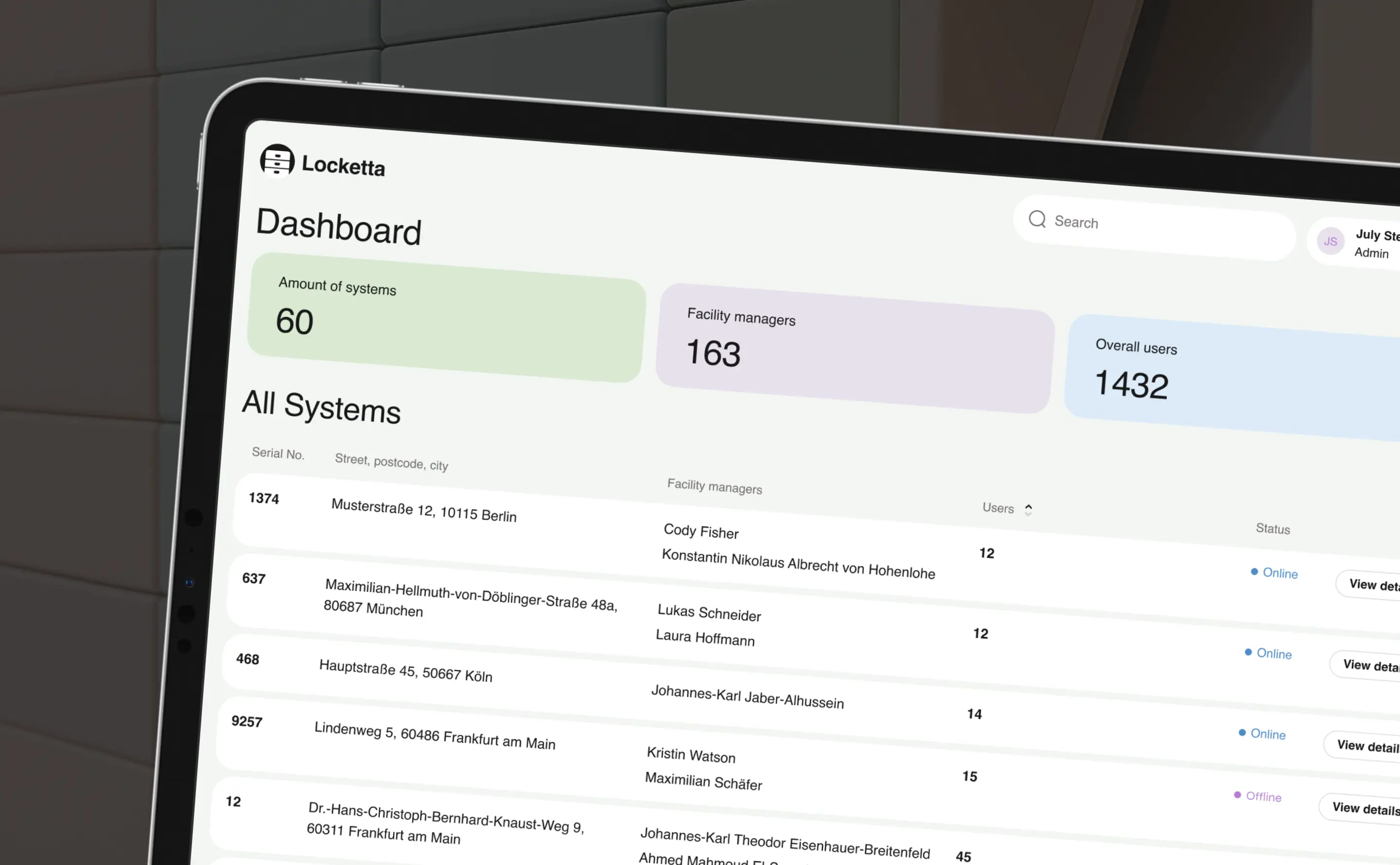 A prominent header anchors every screen, instantly letting an admin know which location or locker network they’re currently managing.