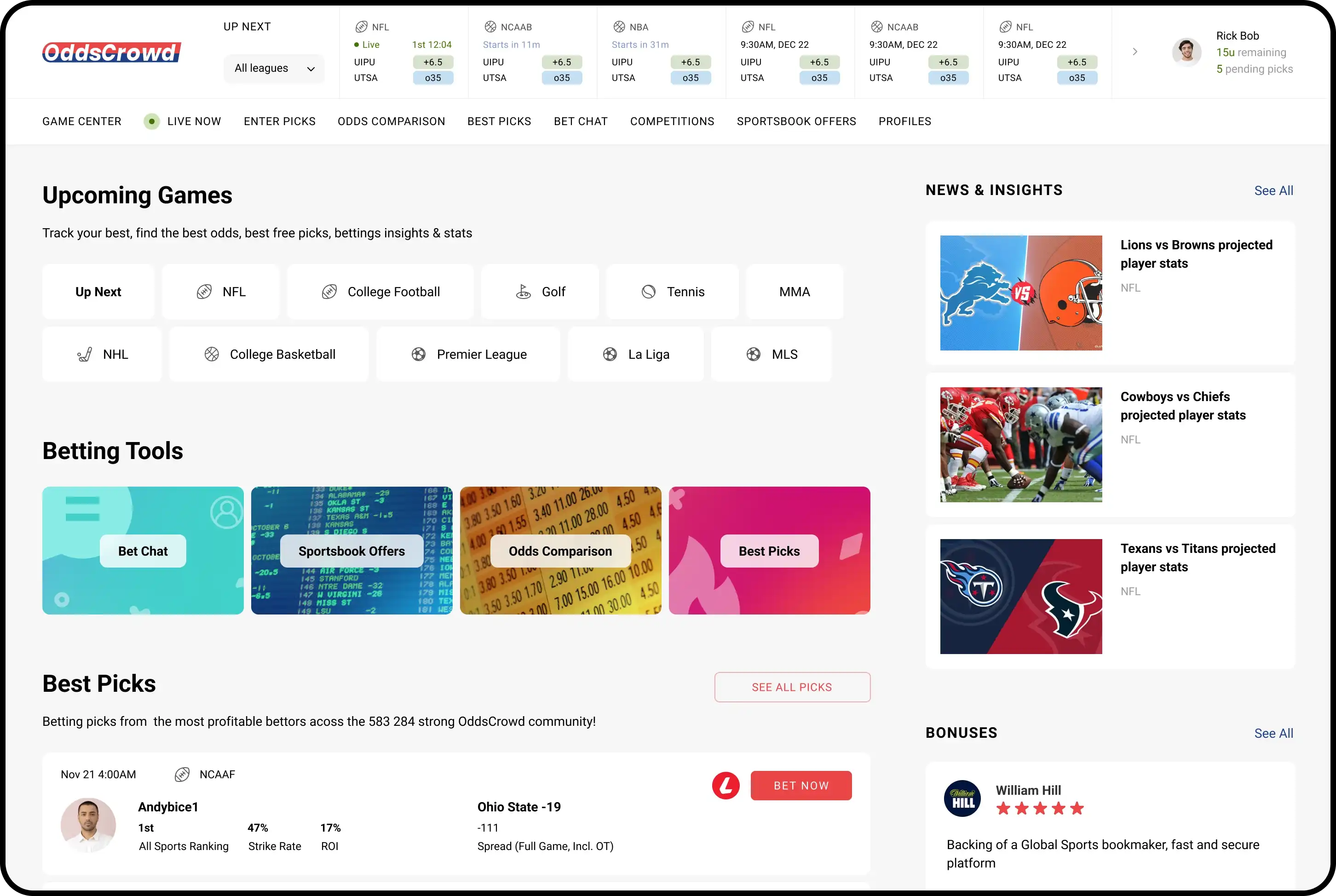 In 2018, the OddsCrowd team came to us with the idea to create a sports betting community with useful betting resources. Their plan was to let users make forecasts for the outcomes of events, while the service will track their success and create the leaderboard to be displayed on the main page. Other users will be able to see this rating and buy forecasts for future events from those whose predictions they trust.