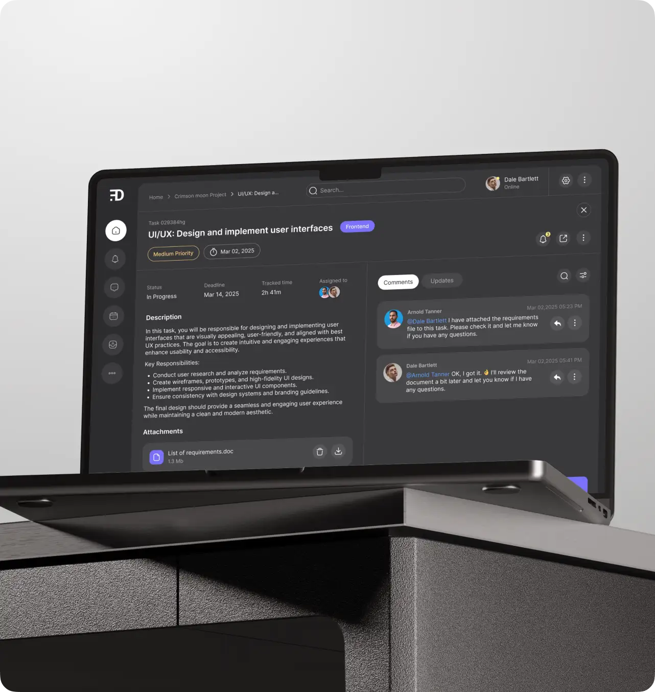 Each task offers space for detailed descriptions, supporting documents, subtasks, and checklists. Users can attach relevant files, add notes or requirements, and break work into actionable steps. Drag-and-drop uploads, integrated file previews, and deadline management tools make all project details not just stored — but easy to update and reference.